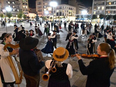 Ο χώρος έξω από το Δημοτικό Θέατρο «Απόλλων» στην πλατεία Γεωργίου, μετατράπηκε επίσης σε μία μουσικοχορευτική σκηνή, με τα 45 μέλη του συγκροτήματος να παρουσιάζουν χορούς, τραγούδια και μουσικές από τη χώρα τους.