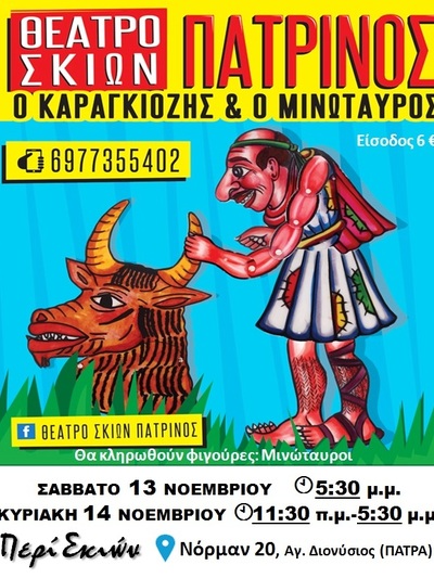 «Ο Καραγκιόζης και ο Μινώταυρος», μια παράσταση που βασίζεται στο γνωστό μύθο με ήρωα το Θησέα και με βοηθό τον θαρραλέο Καραγκιόζη να αντιμετωπίζουν τον Μινώταυρο στον λαβύρινθο της Μινωικής Κρήτης, τη Κνωσό.