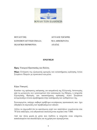 Στο πλαίσιο του κοινοβουλευτικού ελέγχου, ο βουλευτής Αχαΐας της Νέας Δημοκρατίας (πρώην γενικούς γραμματέας Αντεγκληματικής Πολιτικής) Άγγελος Τσιγκρής, κατέθεσε Ερώτηση προς τον Υπουργό Προστασίας του Πολίτη, με την οποία ζητάει την ενίσχυση της Εξωτερικής Φρουράς του καταστήματος κράτησης Αγίου Στεφάνου Πατρών με προσωπικό και μέσα.