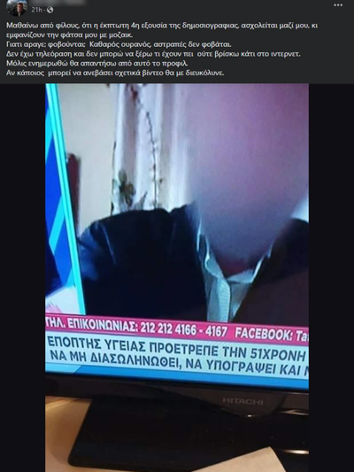 Δεν έχω τηλεόραση και δεν μπορώ να ξέρω τι έχουν πει ούτε βρίσκω κάτι στο ιντερνετ.