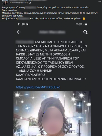 «Έφυγε πριν από λίγο η Π… όπως πληροφορούμαι στη ΜΕΘ του νοσοκομείου Παπανικολάου. Μακάριοι οι εν Κυρίω αποθνήσκοντες, ίνα αναπαύονται εκ των κόπων αυτών. Τα δε έργα αυτών ακολουθεί μετ’ αυτών. Καλή ανάσταση Π… και καλή αντάμωση. Οι φονιάδες σου θα πληρώσουν» ανέφερε αρχικά.