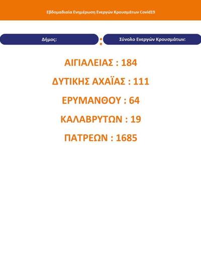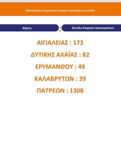 Η ανηφόρα συνεχίζεται αμείωτη στην Αχαϊα που κάθε εβδομάδα ανεβάζει τα ενεργά κρούσματα κορωνοϊού. Είναι χαρακτηριστικό, όπως αναφέρει ο αντιπεριφερειάρχης Αχαϊας Χαράλαμπος Μπονάνος, πώς από τα 1.308 ενεργά κρουσματα στην περιοχή των Πατρών, πήγαμε μέσα σε μια εβδομάδα στα 1.685 και παρότι ακόμα δεν έχουν ξεκινήσει οι άσχημες κλιματολογικές συνθήκες, στην περιοχή καταγράφουμε το ένα ρεκόρ μετά το άλλο.