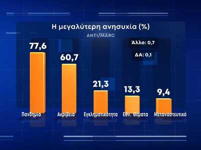 Με βάση τα ευρήματα της έρευνας, αυτό που ανησυχεί πιο πολύ τους ερωτηθέντες είναι η πανδημία με ποσοστό 77,6%, ενώ ακολουθεί η ακρίβεια με ποσοστό 60,7%.