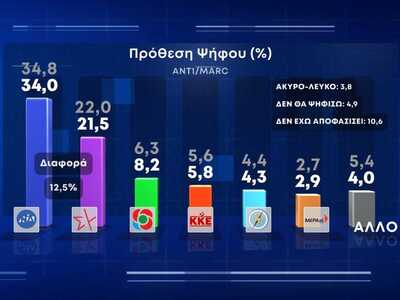 Στην πρόθεση ψήφου, η ΝΔ προηγείται με διαφορά 12,5 μονάδων του ΣΥΡΙΖΑ, συγκεντρώνοντας ποσοστό 34%, έναντι 21,5% του κόμματος της αξιωματικής αντιπολίτευσης.