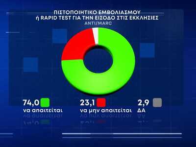 Για το αν χρειάζεται πιστοποιητικό εμβολιασμό ή rapid test για την είσοδο στις εκκλησίες, το 74% απάντησε θετικά, σε αντίθεση με το 23,1% που συμφωνεί με τα τωρινά μέτρα.