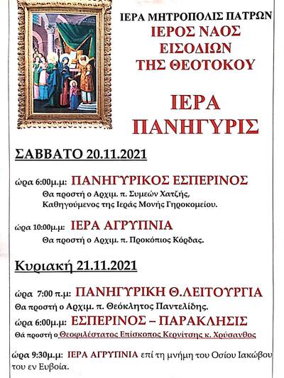 Τα Εισόδια της Υπεραγίας Θεοτόκου τιμά και γιορτάζει η εκκλησία μας στις 21 Νοεμβρίου 2021 και στον ομώνυμο ιερό ναό που ανήκει στην ενορία του Αγίου Νικολάου Πατρών θα πραγματοποιηθεί διήμερη θρησκευτική πανήγυρη.