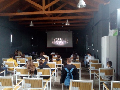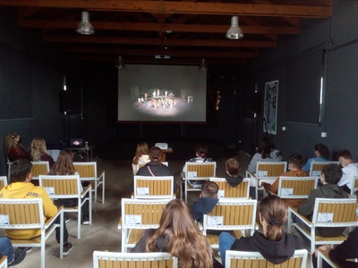 Στη συνέχεια οι μαθητές παρακολούθησαν στην αίθουσα Κ7 των Παλαιών Σφαγείων (αίθουσα Καραγκιόζη) προβολή βίντεο με αποσπάσματα των παραστάσεων αρχαίου δράματος του θεάτρου Καρόλου Κουν «Αγαμέμνων» σε σκηνοθεσία Καρόλου Κουν, «Τρωαδίτισσες» σε σκηνοθεσία Γιώργου Λαζάνη, «Όρνιθες» σε σκηνοθεσία Καρόλου Κουν, «Νεφέλες» σε σκηνοθεσία Γιώργου Λαζάνη και «Εκκλησιάζουσες» σε σκηνοθεσία Διαγόρα Χρονόπουλου, που ανέβηκαν στο Αρχαίο Θέατρο Επιδαύρου.
