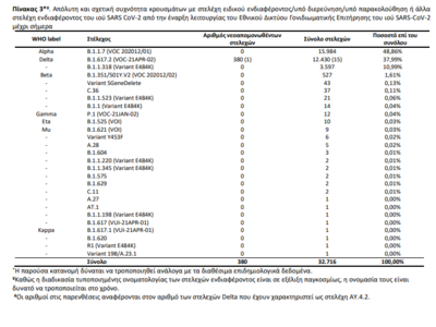 Ολοκληρώθηκε από το Eθνικό Δίκτυο Γονιδιωματικής Επιτήρησης του ιού SARS-CoV-2, που λειτουργεί υπό το συντονισμό του ΕΟΔΥ, η γονιδιωματική ανάλυση σε 394 δείγματα που έχουν επιλεγεί τυχαιοποιημένα ή στοχευμένα και αφορούν στην περίοδο 4 Σεπτεμβρίου 2021 έως 5 Νοεμβρίου 2021. Από τον έλεγχο των 394 δειγμάτων, αναδείχθηκαν συνολικά 380 δείγματα με στελέχη ειδικού ενδιαφέροντος (Variants Of Concern - VOC).