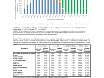 Από τα δείγματα αυτά, 38,15% αφορούν στο B.1.1.318 (Variant E484K), 35,12% στο Delta, 15,70% στο Alpha, 5,88% στο Beta, 0,12% στο C.36, 0,09% στο Gamma, 0,09% στο Eta και 0,09% στο A.28.