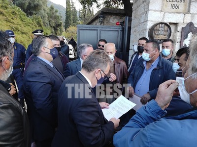 Οι αγρότες εν αναμονή της άφιξης του υπουργού επέδωσαν ψήφισμα με τα αιτήματά τους στους βουλευτές της Νέας Δημοκρατίας που βρέθηκαν στην εκδήλωση.