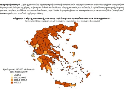 Ο αριθμός των ασθενών που νοσηλεύονται διασωληνωμένοι είναι 590 (60.8% άνδρες). Η διάμεση ηλικία τους είναι 65 έτη. To 83.4% έχει υποκείμενο νόσημα ή/και ηλικία 70 ετών και άνω. Μεταξύ των ασθενών που νοσηλεύονται διασωληνωμένοι, 490 (83.05%) είναι ανεμβολίαστοι ή μερικώς εμβολιασμένοι και 100 (16.95%) είναι πλήρως εμβολιασμένοι. Από την αρχή της πανδημίας έχουν εξέλθει από τις ΜΕΘ 3.438 ασθενείς. Οι εισαγωγές νέων ασθενών Covid-19 στα νοσοκομεία της επικράτειας είναι 385 (ημερήσια μεταβολή -14.82%). Ο μέσος όρος εισαγωγών του επταημέρου είναι 433 ασθενείς. Η διάμεση ηλικία των κρουσμάτων είναι 38 έτη (εύρος 0.2 έως 106 έτη), ενώ η διάμεση ηλικία των θανόντων είναι 78 έτη (εύρος 0.2 έως 106 έτη).