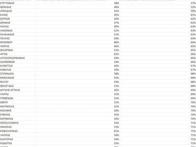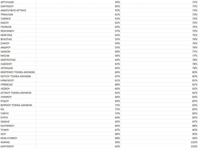 Αντίθετα, μόλις 6 Περιφερειακές Ενότητες έχουν καταφέρει να υπερβούν το 70%, με πρωταθλήτρια τη Μύκονο (80%) και ακολουθούν η Σαντορίνη (79%), η Μήλος (75%), η Πάρος (73%) και η Κως (73%).