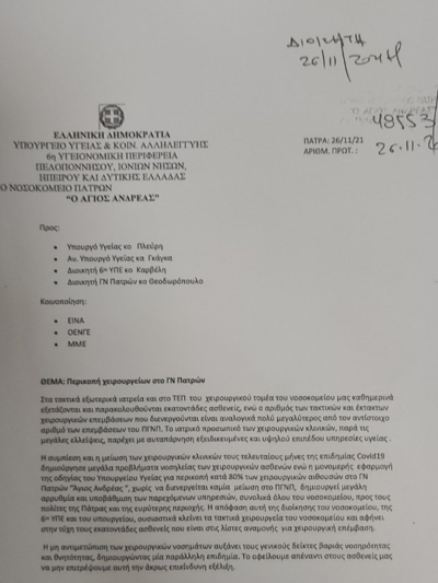 Την αντίθεσή τους εκφράζουν οι Συντονιστές Διευθυντές των Χειρουργικών κλινικών του Γενικού Νοσοκομείου Πατρών Άγιος Ανδρέας για την εφαρμογή της οδηγίας για μείωση των τακτικών χειρουργείων. Όπως επισημαίνουν η εφαρμογή της οδηγίας για μείωση των τακτικών χειρουργείων στο 80% είναι μονομερής. Όπως αναφέρουν δεν γίνεται καμία μείωση στο Πανεπιστημιακό Νοσοκομείο της Πάτρας, με αποτέλεσμα να αφήνονται στην τύχη τους εκατοντάςες ασθενείς.