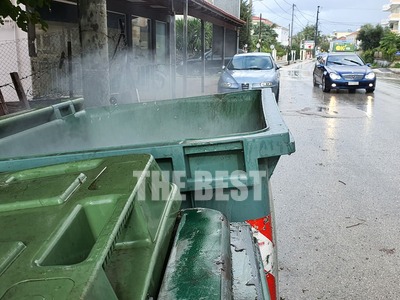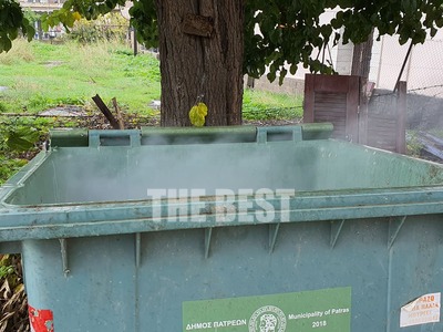 Φωτιά έπιασε κάδος απορριμμάτων πριν λίγο στην περιοχή του Προαστείου στην Πάτρα. Μέσα στη βροχή ο κάδος...βγάζει καπνούς.