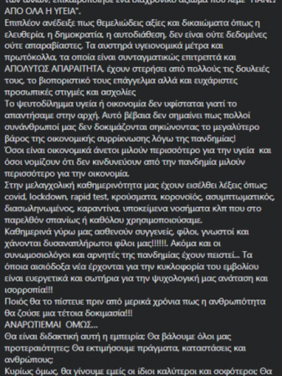 Σε άλλο σημείο έγραφε ότι ότι «καθημερινά γύρω μας ασθενούν συγγενείς, φίλοι γνωστοί… ακόμα και οι αρνητές της πανδημίας έχουν πειστεί…».