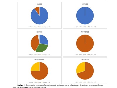· Έγινε παρακολούθηση της συχνότητας διαφορετικών στελεχών του ιού από τον Μάιο έως τον Οκτώβριο του 2021. Αρχικά την περίοδο Μαΐου-Ιουνίου υπήρχε επικράτηση του «Βρετανικού» στελέχους (Β.1.1.7 ή Alpha), ενώ σταδιακά αυξήθηκε η αντιπροσώπευση του «Ινδικού» στελέχους (Β.1.617.2 ή Delta) από τον Ιούλιο και μετέπειτα αποτέλεσε το επικρατέστερο στέλεχος στην Περιφέρεια Δυτικής Ελλάδος (Εικόνα 2).