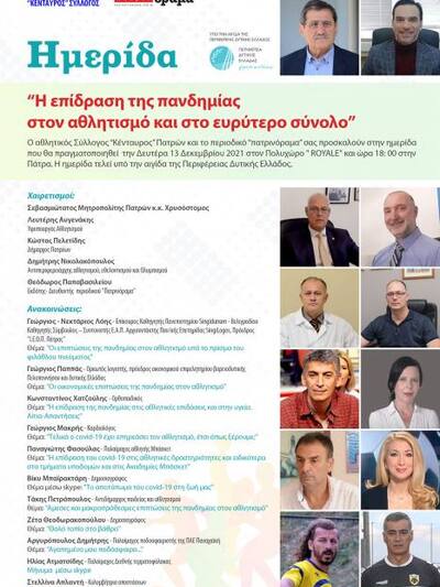Ο αθλητικός σύλλογος «Κένταυρος» σε συνεργασία με την Περιφέρεια Δυτικής Ελλάδας και το περιοδικό «Πατρινόραμα» οργανώνουν μία αθλητική Ημερίδα με θέμα: «Η επίδραση της πανδημίας στον αθλητισμό και γενικότερα στο ευρύτερο σύνολο». Η εκδήλωση θα πραγματοποιηθεί στην αίθουσα εκδηλώσεων του πολυχώρου «Royal» (παλαιό Πτωχοκομείο) στην Aκτή Δυμαίων 51 στην Πάτρα την Δευτέρα 13/12/2021 στις 6 το απόγευμα.