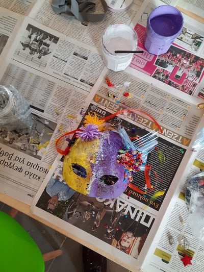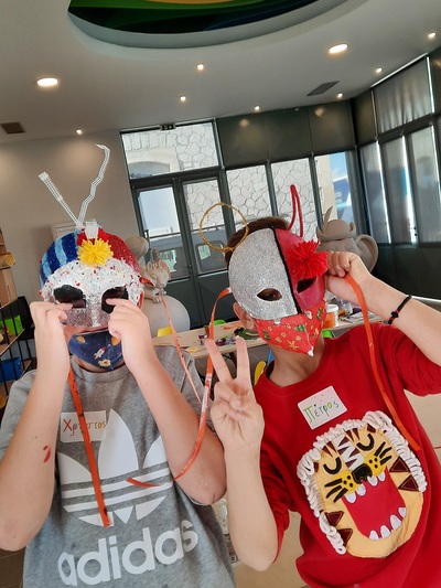 Η εκπαιδευτική διαδικασία και διαδραστική συμμετοχή των μικρών συνεχίστηκε με το εκπαιδευτικό εργαστήριο - σεμινάριο με θέμα «Καρναβαλική μάσκα» που πραγματοποιήθηκε στην αίθουσα δημιουργικών εργαστηρίων ΝΚ2. Εκεί εκπαιδεύτηκαν την τεχνική της κατασκευής καρναβαλικής μάσκας με χαρτί και ατλακόλ και στη συνέχεια κατασκεύασαν τις δικές τους εξαιρετικές καρναβαλικές μάσκες.