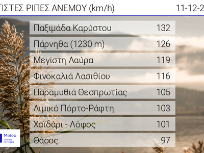 Παράλληλα, ισχυροί έως θυελλώδεις νότιοι άνεμοι επικράτησαν σε θαλάσσιες, νησιωτικές και ηπειρωτικές περιοχές. Η ισχυρότερη ριπή ανέμου έως τις βραδινές ώρες του Σαββάτου 11/12 σημειώθηκε στην Παξιμάδα Καρύστου και ήταν ίση με 132 χλμ/ώρα. Στον σχετικό πίνακα παρουσιάζονται οι 8 σταθμοί που κατέγραψαν τις ισχυρότερες ριπές.