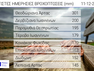 Καθώς οι βροχοπτώσεις από το ισχυρό κύμα κακοκαιρίας συνεχίζονται στο μεγαλύτερο μέρος της χώρας, το αθροιστικό ύψος βροχής στην Ήπειρο έσπασε το φράγμα των 300 χιλιοστών. Όπως προκύπτει από τον πίνακα που παρουσιάζει τους 8 σταθμούς του δικτύου αυτόματων μετεωρολογικών σταθμών του Εθνικού Αστεροσκοπείου Αθηνών / meteo.gr που κατέγραψαν τα μεγαλύτερα ύψη από την αρχή του εικοσιτετραώρου έως τις βραδινές ώρες του Σαββάτου 11/12, ο σταθμός στα Θεοδώριανα Άρτας κατέγραψε 301 χιλιοστά βροχής.