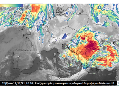 Στην εικόνα του μετεωρολογικού δορυφόρου Meteosat-11 που επεξεργάστηκαν στο Εθνικό Αστεροσκοπείο Αθηνών φαίνονται οι νεφικοί σχηματισμοί του βαρομετρικού χαμηλού που προκαλεί την κακοκαιρία στην χώρα μας τις βραδινές ώρες του Σαββάτου 11/12.