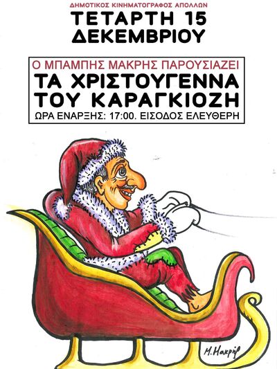 Την Τετάρτη 15 Δεκεμβρίου 2021 στις 5 το απόγευμα, στο κινηματοθέατρο «Απόλλων» στο γειτονικό Αίγιο, θα παιχθεί η γιορτινή κωμωδία «Τα Χριστούγεννα του Καραγκιόζη» από τον Πατρινό καραγκιοζοπαίκτη Μπάμπη Μακρή.