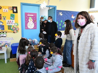 Εκεί τα μικρά παιδιά του Νηπιαγωγείου και οι εκπαιδευτικοί τους, κάλεσαν το Δήμαρχο στην αίθουσά τους, αντάλλαξαν ευχές για τις γιορτές και του χάρισαν μια κάρτα που είχαν δημιουργήσει.