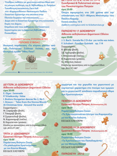Με 3 νέες θεματικές ενότητες συνεχίζονται από την Παρασκευή 17 Δεκεμβρίου 2021 οι εκδηλώσεις που διοργανώνει και φέτος ο Πολιτιστικός Οργανισμός του Δήμου της Πάτρας για τα Χριστούγεννα και την Πρωτοχρονιά.