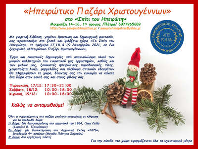 Ηπειρώτικο παζάρι Χριστουγέννων πραγματοποιεί ο Ηπειρωτικό Σύλλογος της Πάτρας στο Σπίτι του Ηπειρώτη στην οδό Μουρούζη. Όπως αναφέρει ο Σύλλογος στην πρόσκλησή του: