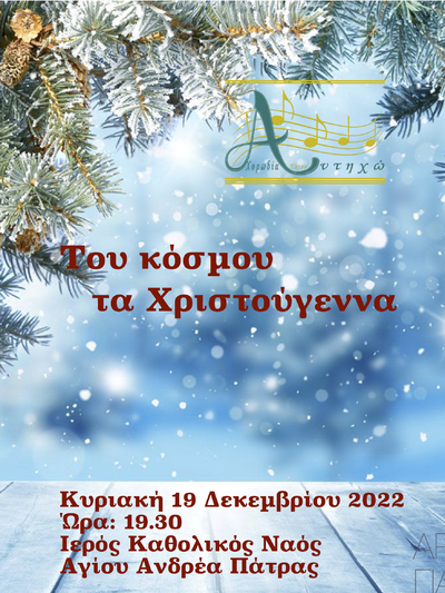 Η Πατρινή Χορωδία Αντηχώ θα πραγματοποιήσει ένα μουσικό ταξίδι με κάλαντα κα Χριστουγεννιάτικες μελωδίες αυτή την γιορτινή Κυριακή 19 Δεκεμβρίου 2021 στις 19.30 στον Ιερό Καθολικό ναό Αγίου Ανδρέα Πάτρας, στην οδό Μαιζώνος μεταξύ της Κολοκοτρώνη και της Αγ. Νικολάου.