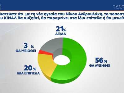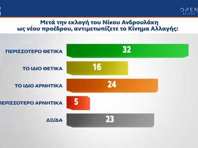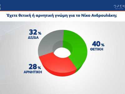 Παράλληλα, ο νέος πρόεδρος του ΚΙΝΑΛ αποτιμάται θετικά από το κοινό καθώς 40% των ερωτηθέντων απαντούν ότι έχουν θετική άποψη για τον Νίκο Ανδρουλάκη.