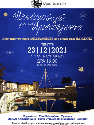 Ο Δήμος Ναυπακτίας, στο πλαίσιο των Εορταστικών του Εκδηλώσεων για τα Χριστούγεννα θα παρουσιάσει ένα μοναδικό μουσικό ταξίδι με την crossover σοπράνο Μάνια Βλαχογιάννη και το μουσικό σχήμα Era Musicale, αυτή την Πέμπτη 23 Δεκεμβρίου 2021, προπαραμονή των Χριστουγέννων στις 19:00, στο Λιμάνι της Ναυπάκτου.