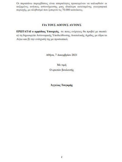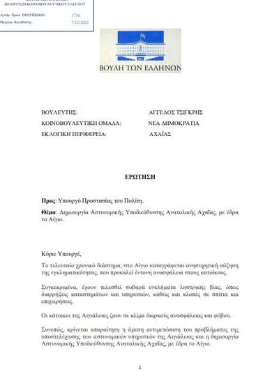 Να σημειωθεί ότι ο Αχαιός βουλευτής, στις 7.12.2021 κατέθεσε Ερώτηση προς τον αρμόδιο Υπουργό Προστασίας του Πολίτη (Αριθμός Πρωτοκόλλου: 1730), με την οποία ζητούσε τη δημιουργία Αστυνομικής Υποδιεύθυνσης με έδρα το Αίγιο και την ενίσχυση της υπηρεσίας με προσωπικό και μέσα.
