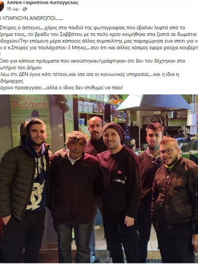 Μάλιστα, το παράδειγμά τους συγκίνησε αρκετούς πολίτες των Χανίων με έναν απ’ αυτούς, σύμφωνα με το cretapost, να παραχωρεί ένα σπίτι για να μείνει ο άστεγος για τουλάχιστον τρεις μήνες ενώ άλλοι του πρόσφεραν ρούχα, κλινοσκεπάσματα και άλλα είδη.
