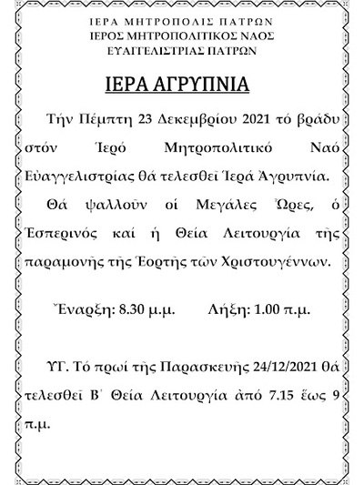 Τέλος την Κυριακή 26/12 το πρωί θα τελεστεί Θεία λειτουργία καθώς και μνημόσυνο των ευεργετών και ενοριτών του Μητροπολιτικού ναού Ευαγγελιστρίας.