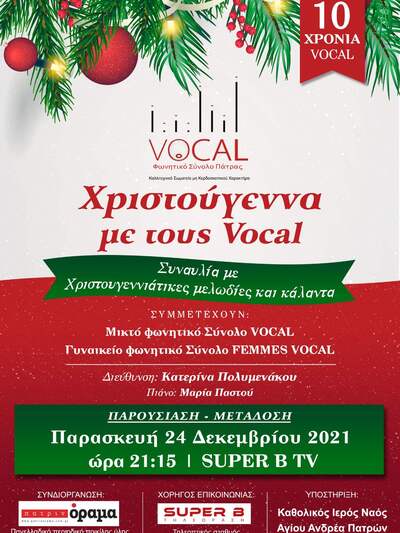 Την Παρασκευή 24/12/2021, παραμονή των Χριστουγέννων στις 21:15 πρόκειται να μεταδοθεί στην τηλεόραση του "Super B TV", η Χριστουγεννιάτικη Συναυλία του Vocal Φωνητικού Συνόλου Πάτρας.