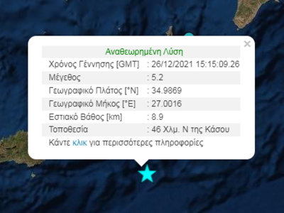 Συγκεκριμένα, στις 5:15 σημειώθηκε σεισμός μεγέθους 5,2 Ρίχτερ. Σύμφωνα με το γεωδυναμικό ινστιτούτο ο σεισός σημειώθηκε 46 χλμ νότια της Κάσου, ενώ το εστιακό βάθος ήταν 8,9 χλμ.