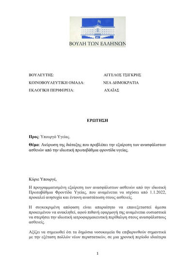 Στο πλαίσιο του κοινοβουλευτικού ελέγχου, ο βουλευτής Αχαΐας της Νέας Δημοκρατίας Άγγελος Τσιγκρής, κατέθεσε ερώτηση προς τον Υπουργό Υγείας Θάνο Πλεύρη, με την οποία ζητά την ακύρωση της διάταξης που προβλέπει την εξαίρεση των ανασφάλιστων ασθενών από την ιδιωτική πρωτοβάθμια φροντίδα υγείας.