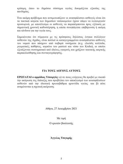 Ο Αχαιός βουλευτής Άγγελος Τσιγκρής ρωτάει τον Υπουργό Υγείας: α) σε ποιες ενέργειες θα προβεί με σκοπό την ακύρωση της διάταξης που προβλέπει τον αποκλεισμό των ανασφάλιστων ασθενών από την ιδιωτική πρωτοβάθμια φροντίδα υγείας και β) πότε αναμένονται η σχετική ακύρωση.