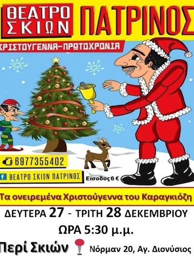 Ο Καραγκιόζης ονειρεύεται και μεταμορφώνεται στον πλέον αγαπημένο ήρωα των παιδιών, σε Άη Βασίλης. Με την κόκκινη στολή πάνω στο έλκηθρο, τον σάκο με τα δώρα που θα τα μοιράσει απλόχερα μαζί με τα γλυκά και τις ευχές στα παιδιά όλου του κόσμου, ο πρωταγωνιστής του θεάτρου σκιών θα μας καταπλήξει ευχάριστα. Μια παράσταση με πολλά μηνύματα, με τα ξωτικά των Χριστουγέννων, τα σκανταλιάρικα καλικαντζαράκια και με τους ήρωες του Θεάτρου Σκιών να χαρίζουν γέλιο, αγάπη, χαρά και αισιοδοξία για το νέο χρόνο. Η συνέχεια επί της σκηνής στο Περί Σκιών.