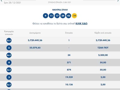 Από τη διαλογή προέκυψε ένας μεγάλος νικητής που κερδίζει 2.729.449 ευρώ. Δεν βρέθηκαν πεντάρια.