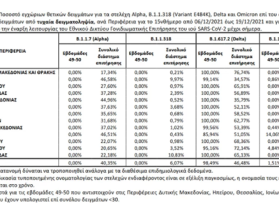 Στον Πίνακα 4 παρουσιάζονται τα αντίστοιχα ποσοστά για τα στελέχη Alpha, B.1.1.318 (Variant E484K), Delta και Οmicron ανά Περιφέρεια.