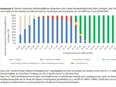 Η διαχρονική εξέλιξη της σχετικής συχνότητας των αλληλουχηθέντων δειγμάτων από τυχαία δειγματοληψία ανά είδος στελεχών, μέχρι και την εβδομάδα 50 απεικονίζεται στο Διάγραμμα 9, ενώ δίνονται επιπλέον προσωρινά στοιχεία για τις εβδομάδες 51-52.