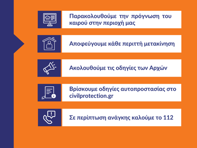 Για περισσότερες πληροφορίες και οδηγίες αυτοπροστασίας από τα έντονα καιρικά φαινόμενα, οι πολίτες μπορούν να επισκεφθούν την ιστοσελίδατης Γενικής Γραμματείας Πολιτικής Προστασίας στην ηλεκτρονική διεύθυνση www.civilprotection.gr.