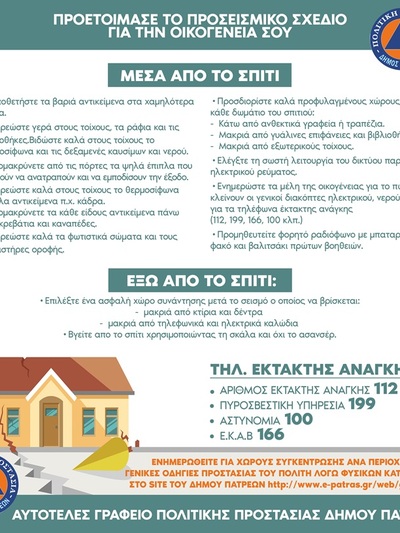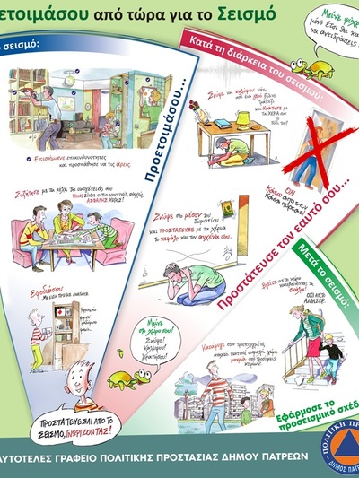 Στο φυλλάδιο –που επισυνάπτεται- δίνονται χρήσιμες πληροφορίες για το πώς μπορούν να προστατευθούν σε περίπτωση σεισμού, μέσα στο σπίτι τους, αλλά και έξω από αυτό, με φωτογραφίες και γραπτές οδηγίες.
