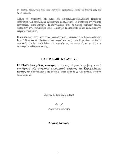 Στο πλαίσιο του κοινοβουλευτικού ελέγχου, ο βουλευτής Αχαΐας της Νέας Δημοκρατίας Άγγελος Τσιγκρής, κατέθεσε Ερώτηση προς τον Υπουργό Υγείας, με την οποία ζητά τη δημιουργία ακοολογικού τμήματος στο Καραμανδάνειο Παιδιατρικό Νοσοκομείο Πατρών.