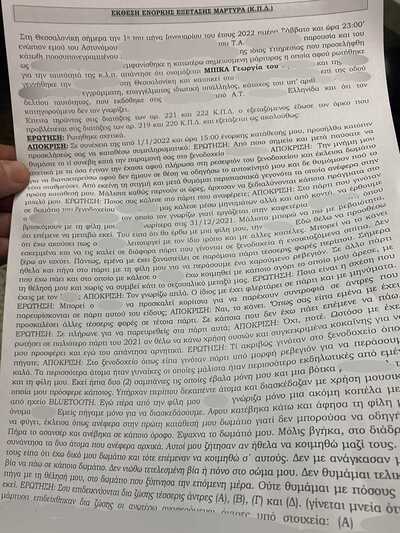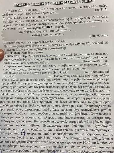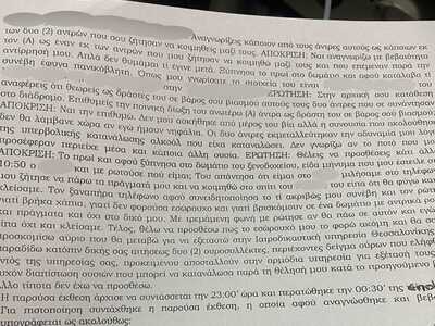 Με τρεμάμενη φωνή με ρώτησε αν θα πάω σε αυτόν και εγώ του είπα όχι και κλείσαμε. Τέλος, θέλω να προσθέσω πως το εσώρουχό μου το φοράω ακόμη και θα σας το προσκομίσω αύριο που θα μεταβώ για να εξεταστώ στον γιατρό στη δικαστική υπηρεσία Θεσσαλονίκης. Σας παραδίδω κατόπιν αιτήσεώς σας δύο ουροσυλλέκτες περιέχοντες δείγμα ούρων που ελήφθησαν εντός της υπηρεσίας, προκειμένου να αποσταλούν στην αρμόδια υπηρεσία για εξέταση τους προς διαπίστωση ουσιών που μπορεί να είχα καταναλώσει, παρά τη θέλησή μου, κατά το προηγούμενο βράδυ και τίποτα άλλο δεν έχω να προσθέσω».