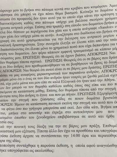 Απόκριση: Ήμουν σε κατάσταση πανικού εκείνη την στιγμή και αυτό που έκανα ήταν να φύγω όσο πιο γρήγορα μπορούσα από κει. Δεν είδα κάτι. Βγήκα απ’ το δωμάτιο, μπήκα στο ασανσέρ και έτρεξα στο αυτοκίνητο μου, που ήταν σταθμευμένο όπισθεν του ξενοδοχείου επιβιβάστηκα σε αυτό και ήρθα στην υπηρεσία σας. Επιθυμώ την ποινική τους διώξει γιατί σε βάρος μου πράξη. Επιθυμώ την ιατροδικαστική εξέταση. Τίποτα άλλο δεν έχω να προσθέσω και υπογράφω.