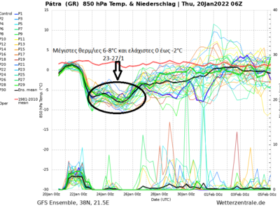 Χαρακτηριστικό το παρακάτω διάγραμμα ensemble για την πόλη της Πάτρας, με τις πολύ χαμηλές θερμοκρασίες να κυριαρχούν το ερχόμενο διάστημα.