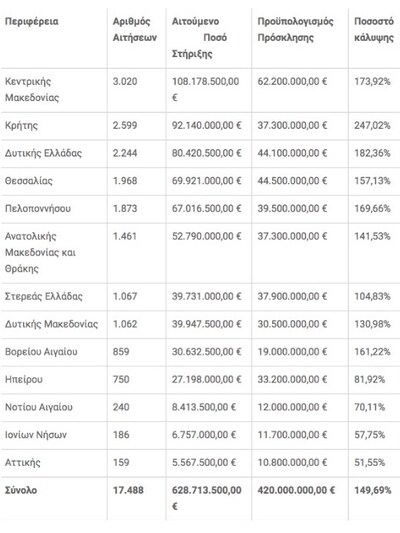 Το συνολικό ποσό που έχει αιτηθεί η περιφέρεια είναι 80.420.000 ευρώ ενώ ο προϋπολογισμός της προκήρυξης αγγίζει τα 44.100.000 ευρώ και το ποσοστό κάλυψης φθάνει το 182,36%.